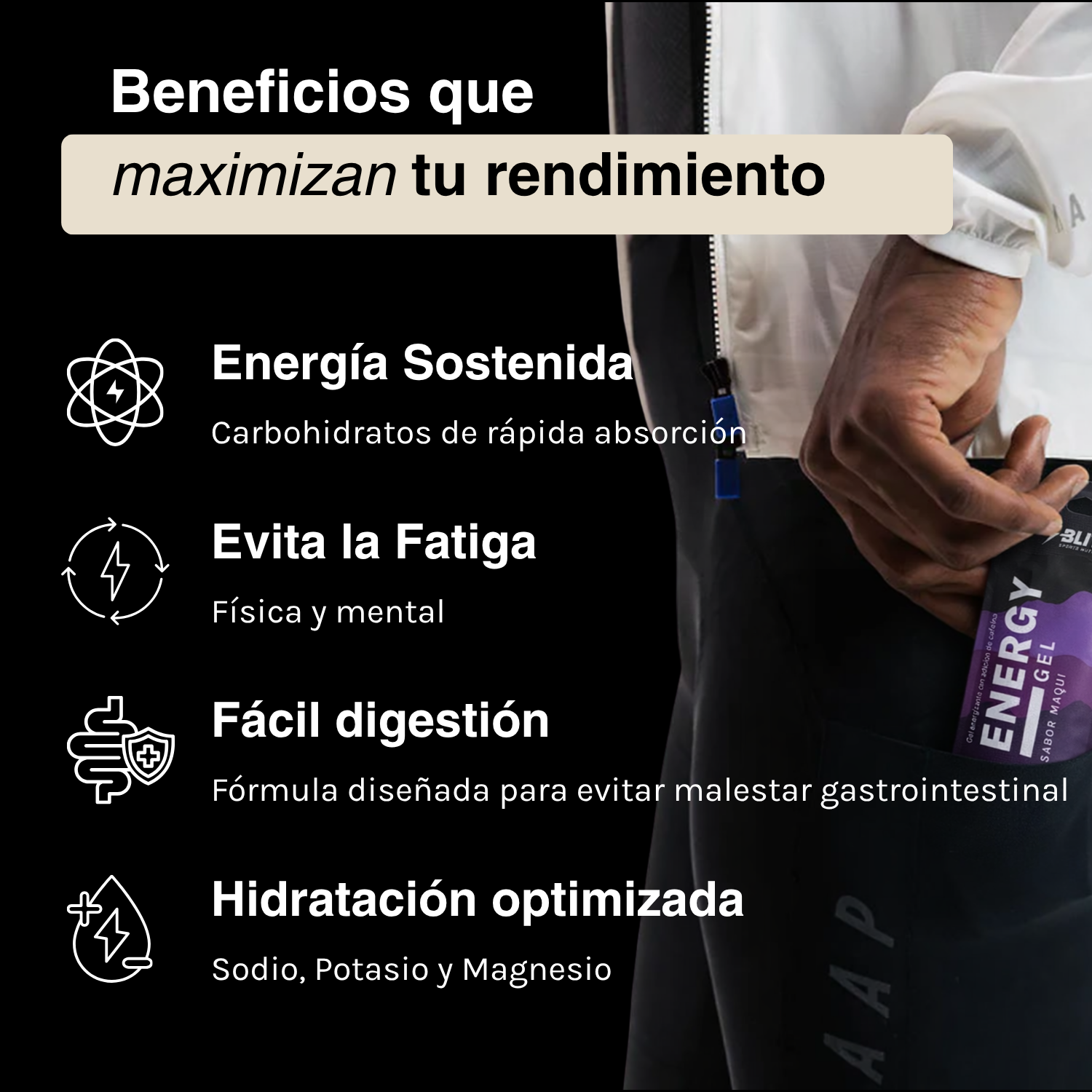 Fatiga mental: La versión con cafeína contiene 100 mg por gel, ayudando a mantener la concentración y retrasando la sensación de agotamiento.